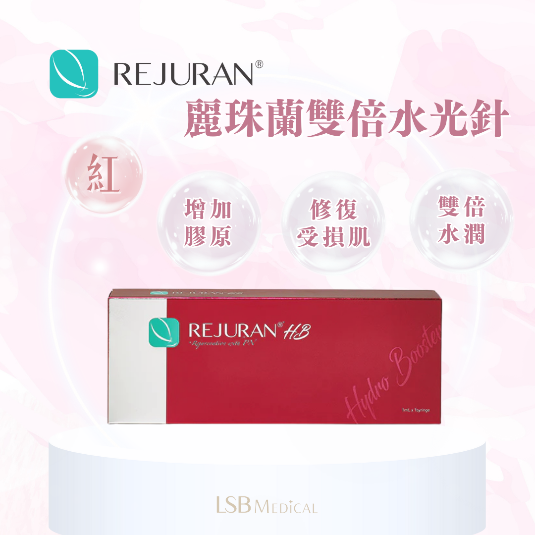 REJURAN麗珠蘭(紅盒)雙倍水光針,專門修復因紫外線、老化和過度施術引起受損肌膚。核心成分HB紅盒為黑盒的雙倍滋潤,均是針對受損肌膚進行保濕修復。