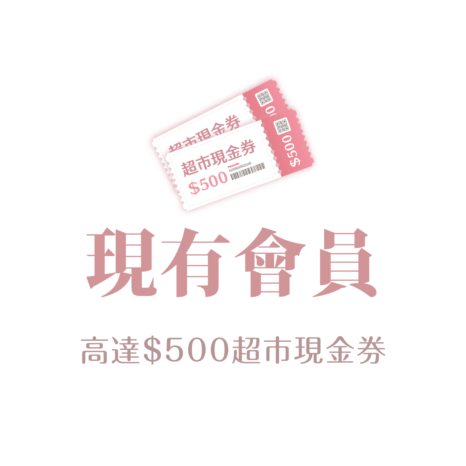 全新客戶首次消費滿指定金額,推薦人即可獲得HK$100、HK$300或HK$500超市禮券。