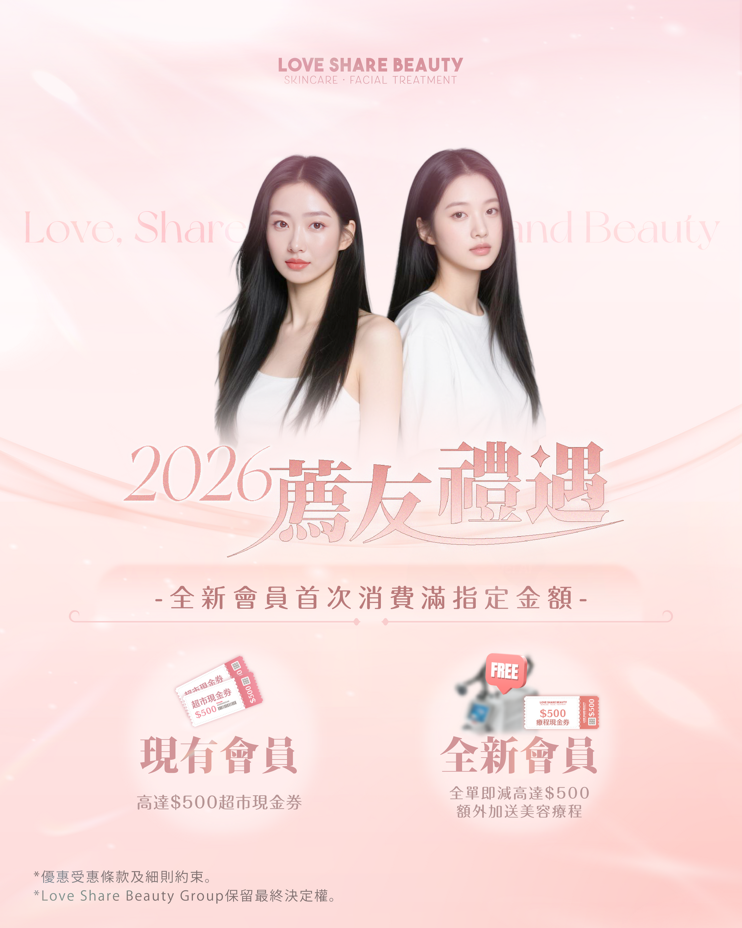 即日起全新客戶只需出示任何香港美容院一年內的療程購買記錄,並於Love Share Beauty首次消費滿$5,000(折扣後計算),即可免費獲贈指定美容療程5次,內容涵蓋清潔、保濕、緊緻、煥膚、養生,賞您由內靚到外!