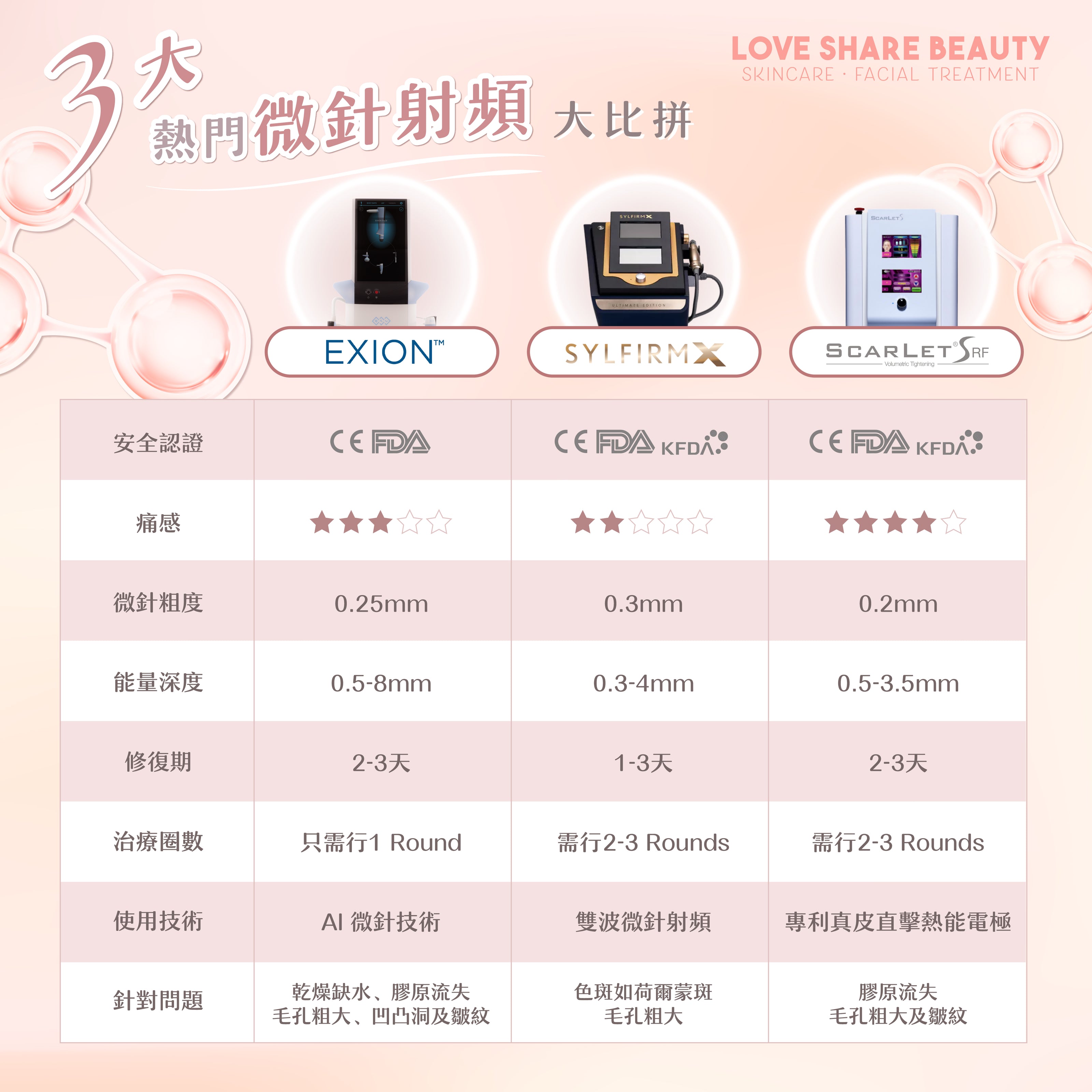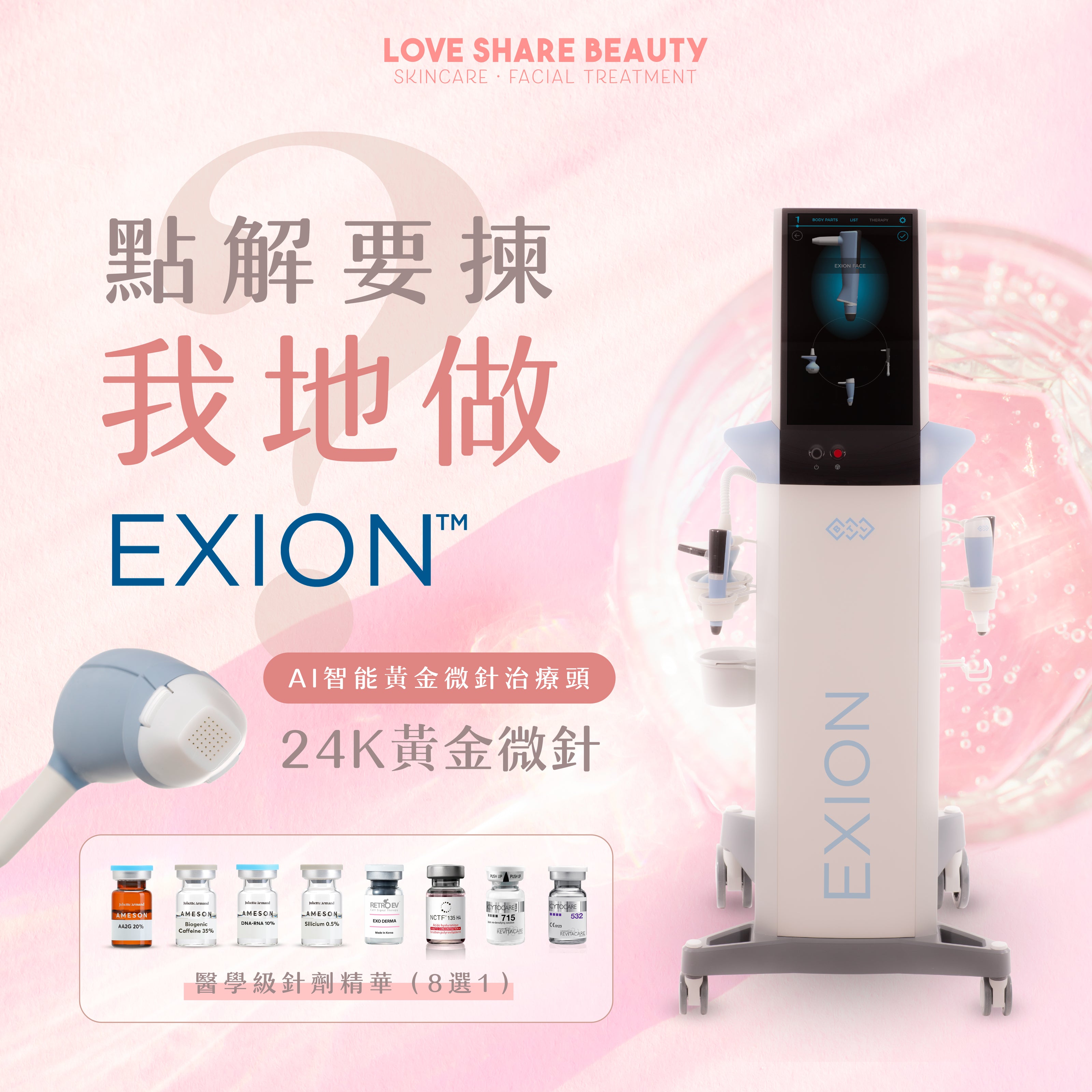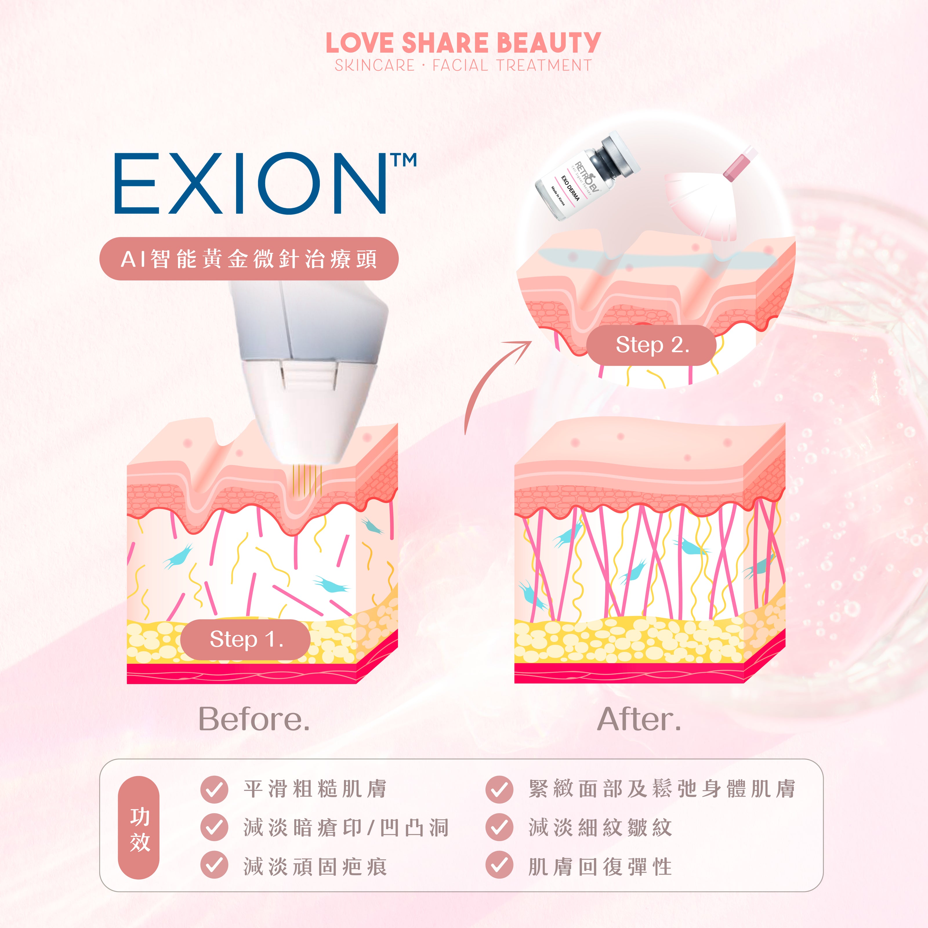 EXION™ 黃金微針以嶄新 Fractional RF射頻微針技術,解決18歲至60歲的面上及身體上的肌膚特殊需要。以突破性技術 - 單極射頻結合 AI 人工智能控制微針技術,高效能量穿透至真皮層,精準深入面部 0.5 - 2.5mm及身體1.5 - 8mm,有效激發纖維母細胞製造透明質酸、膠原和彈力蛋白,重點改善粗糙、鬆弛肌、暗瘡印凹凸洞、疤痕、妊娠紋、皺紋及老化膚質,瞬間令你回復年輕、彈滑緊緻肌,最佳有效治療面部及身體上的紋理。
