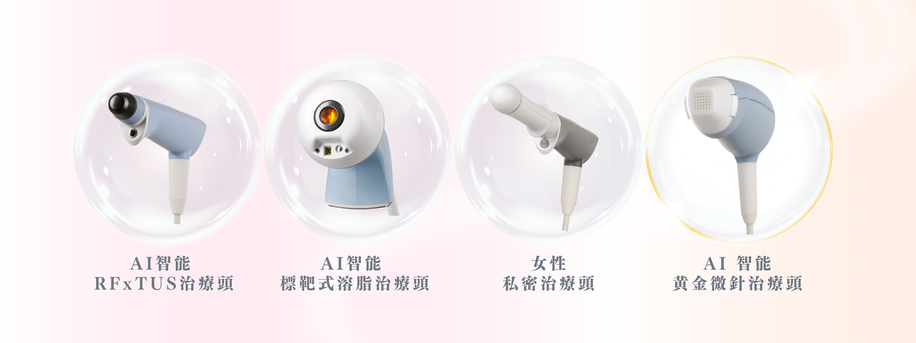 儀器設有4款治療頭,分別是: AI 智能黄金微針治療頭、AI 智能標靶式溶脂治療頭、AI智能 RFxTUS治療頭及女性私密治療頭。儀器均獲美國FDA及CE認證。
