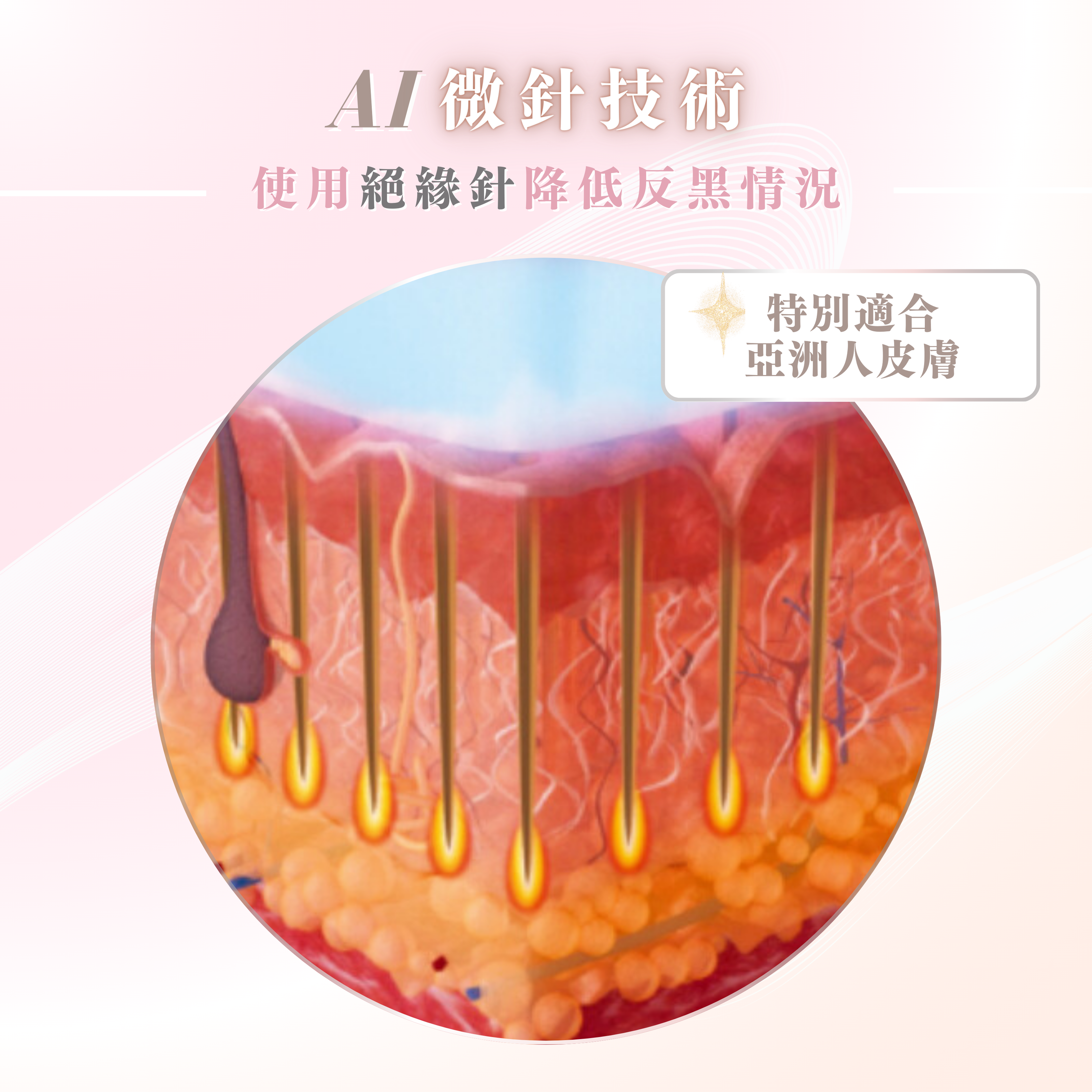 AI微針會因應肌膚狀況分段加熱,並可達至最高75°C,先代謝,再重組真皮層組織。技術激活纖維母細胞,重新製造透明質酸膠原和彈力蛋白,修復問題肌膚。智能能量輸出,減少痛感。