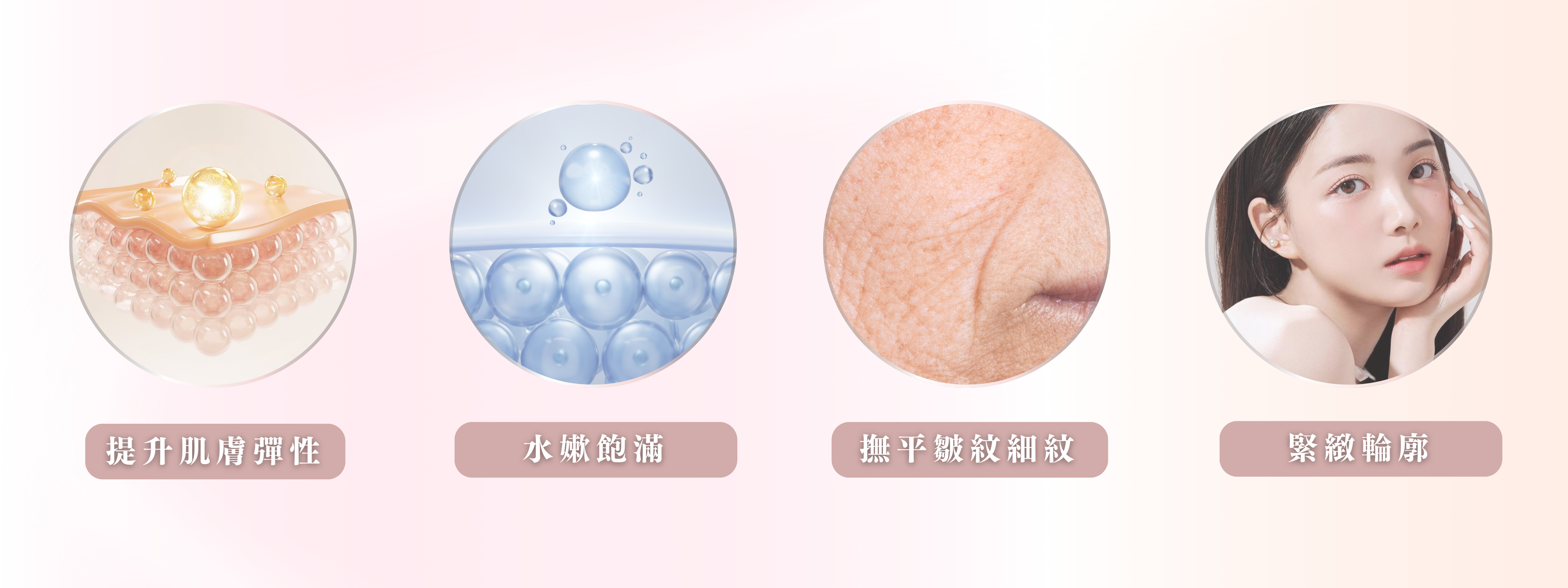 醫學實證,4 次療程,透明質酸 +224%1, 膠原蛋白+47%1, 彈力蛋白 +50%1, 改善膚質 41%1, 客人滿意度 93%1。