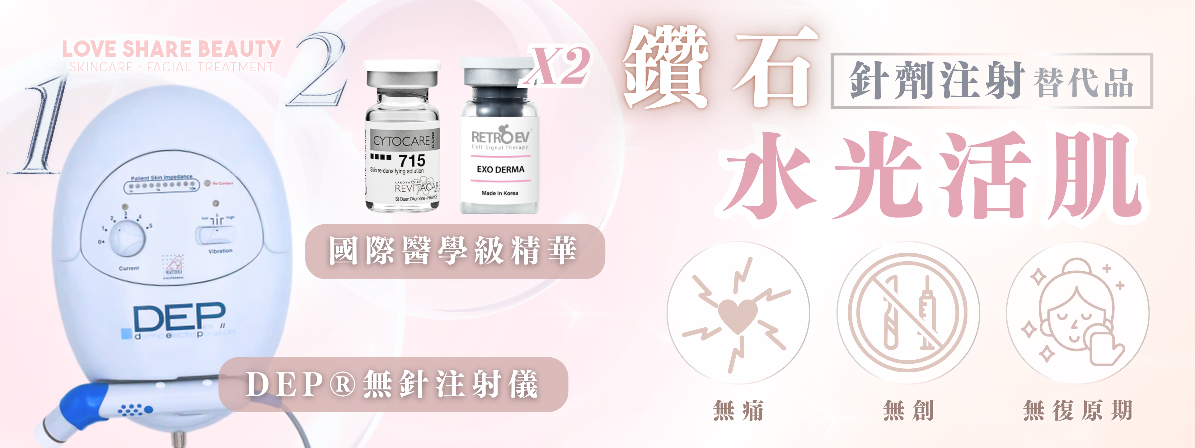 鑽石水光活肌療程是使用獲FDA認證為「針劑注射的替代品」的DEP®無針注射儀,導入國際醫學級精華。