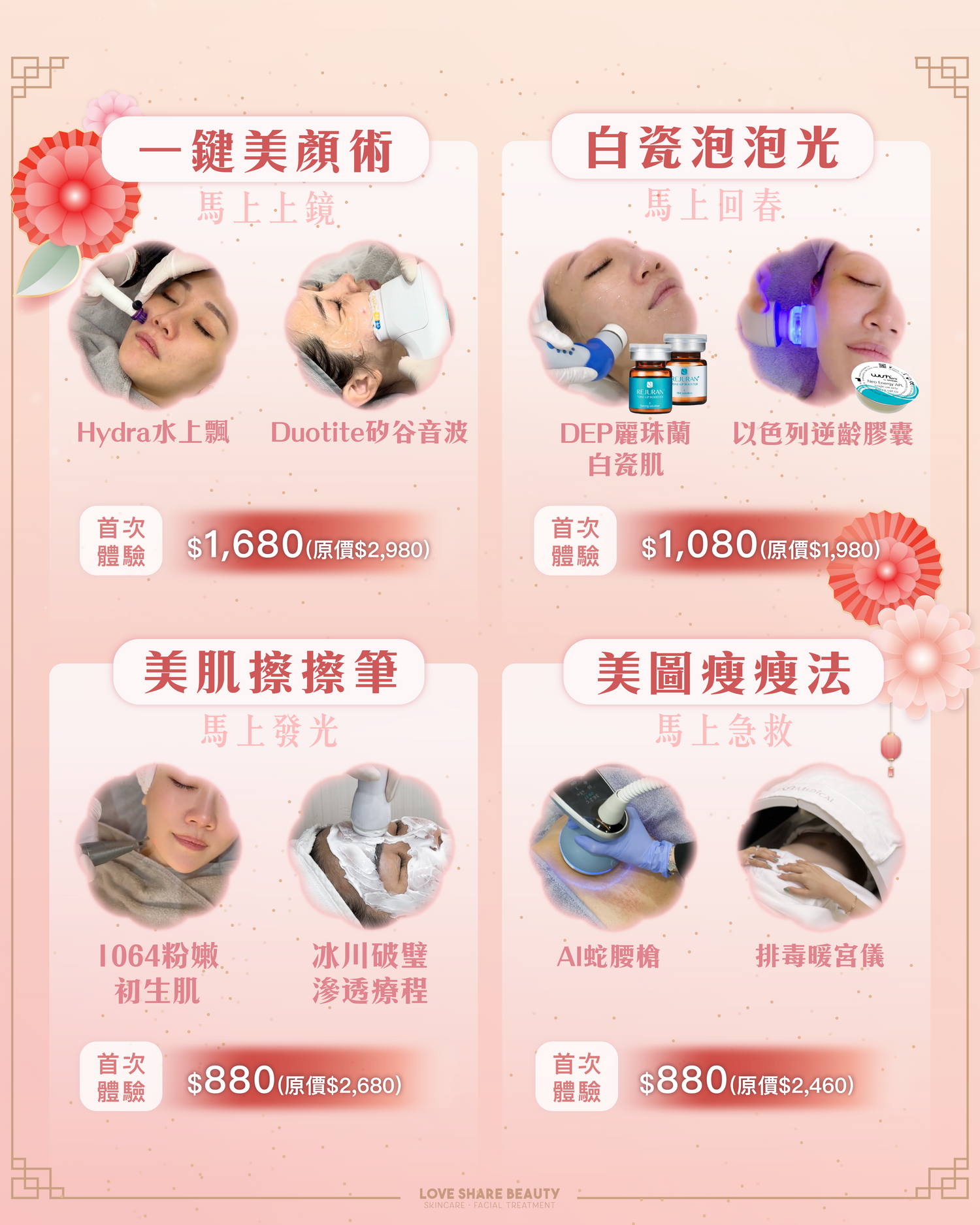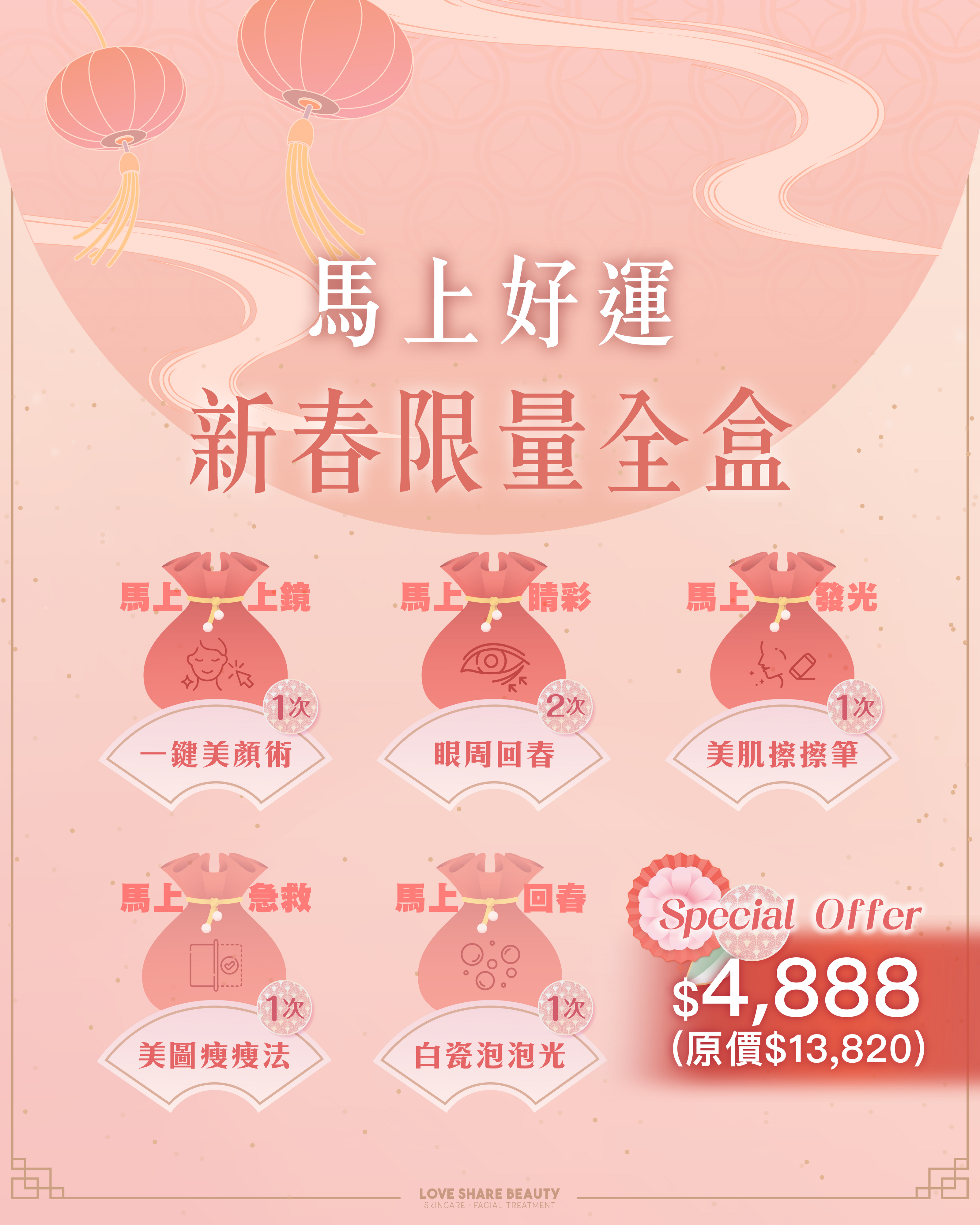 踏入新一年,祝各位馬上有錢!馬上有假!馬上有桃花!知道大家最想馬上變靚😏所以Love Share Beauty 推出四大新春美肌組合,同場加映馬上好運限量全盒,內含六大精選變身皇牌,靚住拜年話都無咁易🙆🏻♀️