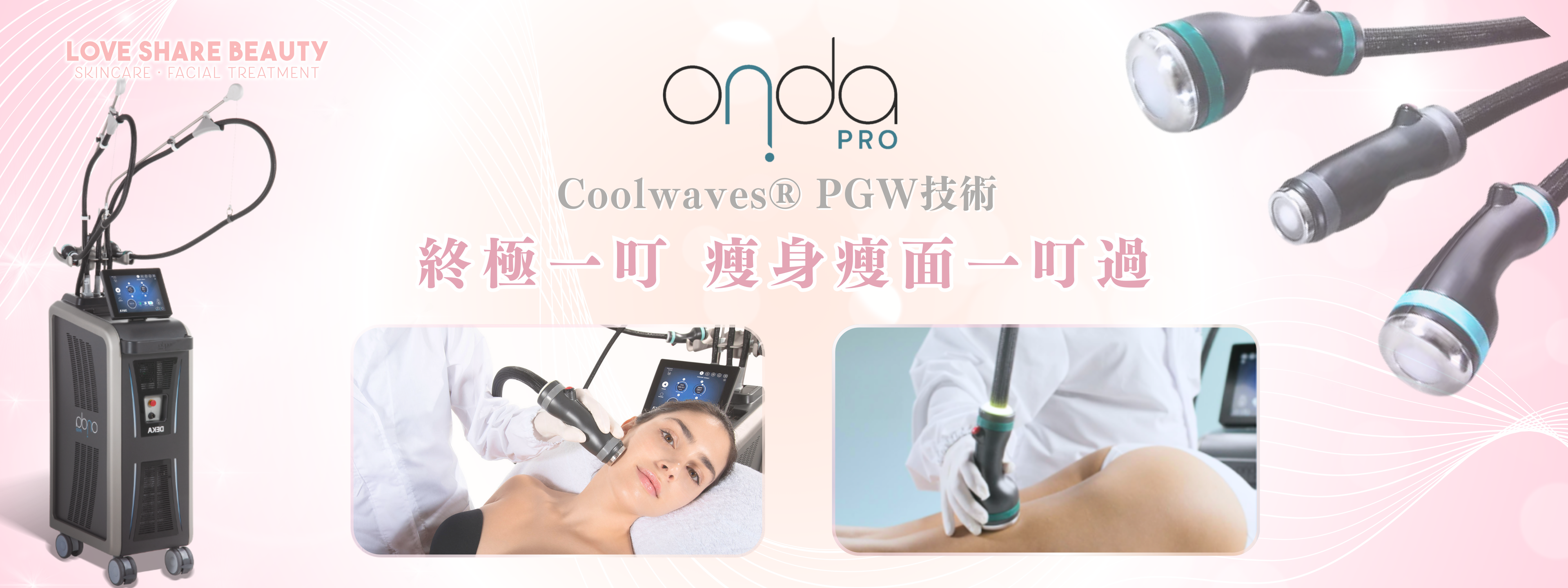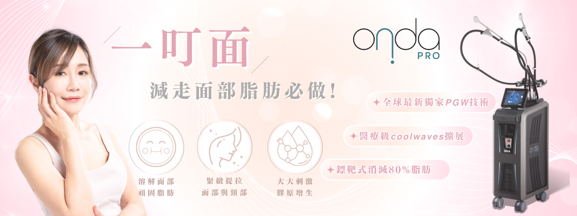 Onda Pro 終極一叮Coolwaves®冷微波能量儀器,結合了PGW 技術,比以往提高更高精準及可控性去破壞及溶解脂肪細胞,而且安全無痛。